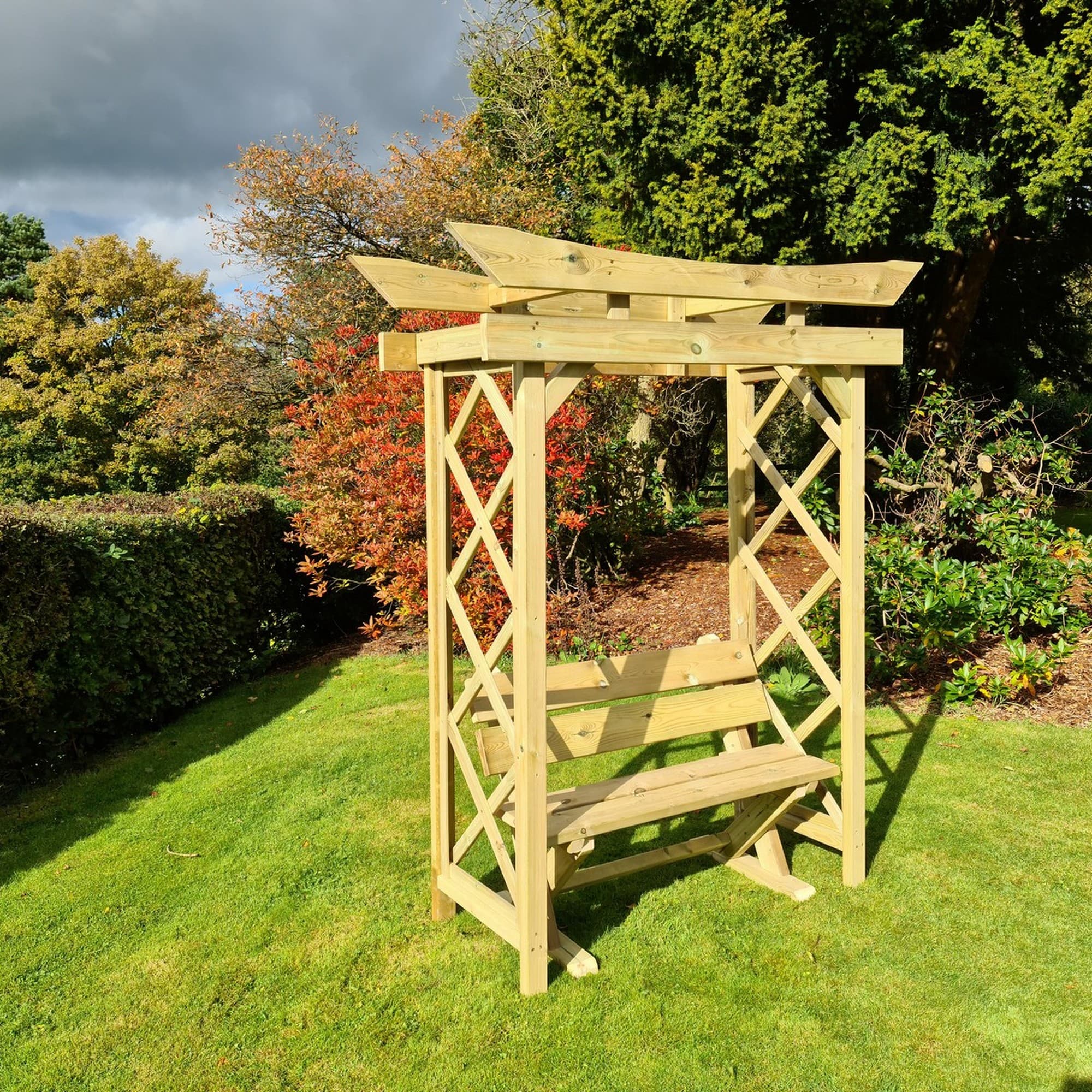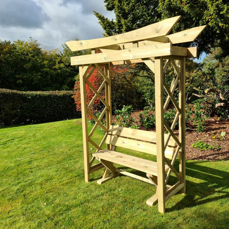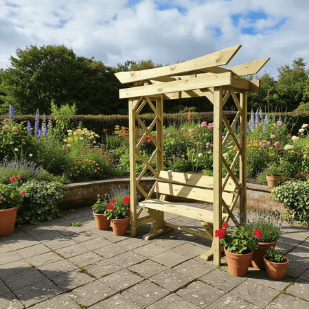 Handmade in the UK, this arbour is constructed from robust, thick timber that ensures durability and stability. The pressure-treated wood is designed to withstand the elements, boasting a remarkable 20-year rot resistance, so you can enjoy your garden feature for years to come. The fully braced design not only enhances the structure's strength but also adds a touch of rustic elegance, making it a standout piece in any garden landscape.