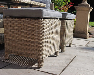 Stools: H: 50cm x W: 43cm x L: 43cm - Material: Durable synthetic rattan with weather-resistant cushions